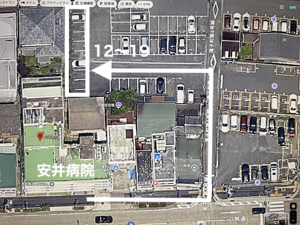 安井病院の向かってすぐ右(東側)の細い道路を入ると左側に駐車場があります。下の画像をご参考に、突き当りの12番〜19番をお使いくださいませ。